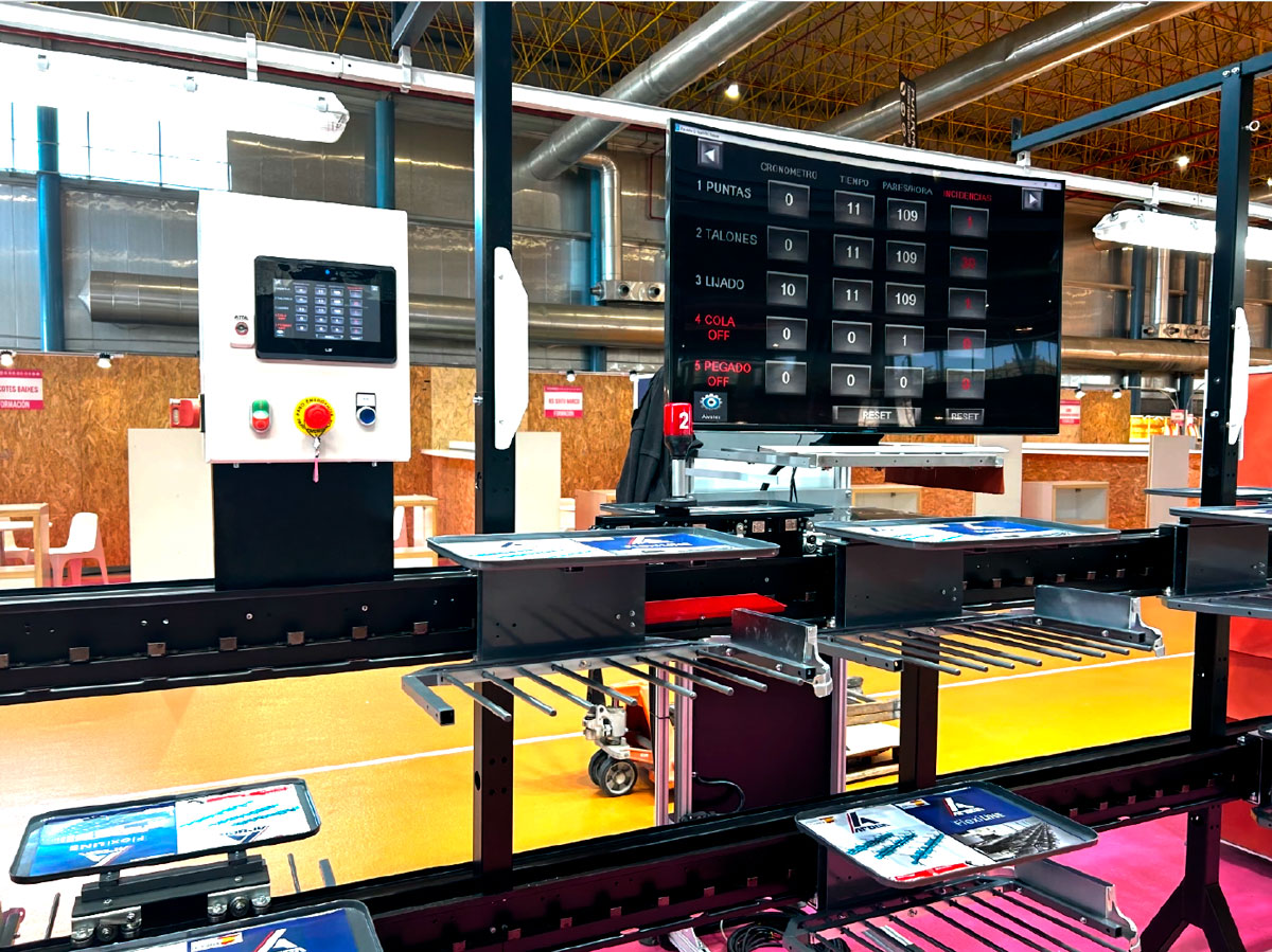 Es el sistema portante por el que se mueven los carritos con las hormas: una línea de montaje modular que estructura el flujo de trabajo.